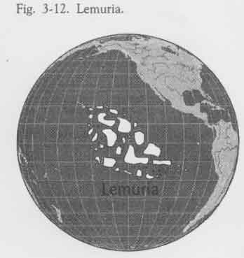 Рис.3-12 показывает не точно, как выглядела Лемурия, но в некотором роде, это на то похоже. Она распространялась от Гавайских островов всё время вниз к острову Пасхи. Это не была сплошная масса земли, но серия из тысячи тесно взаимосвязанных островов. Некоторые из них были большими, некоторые маленькими, и было их значительно больше, чем показано на этом рисунке. Это было подобно континенту, едва находящемуся над уровнем поверхности воды – водяной континент.