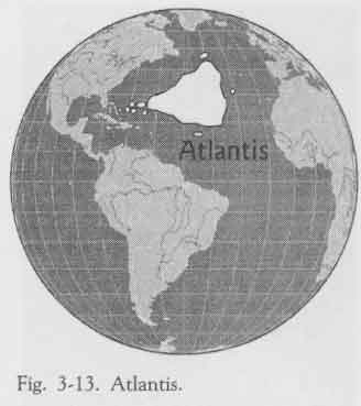 Как здесь показано (Рис.3-13), Атлантида была довольно большим континентом. Юго-восточной части Соединённые Штатов там ещё не было; Флорида, Луизиана, Алабама, Джорджия, Южная Каролина, Северная Каролина и части Техаса находились под водой. Я не знаю, была ли Атлантида таких именно размеров или нет, но она была довольно-таки большой. В действительности, она состояла из этого континента плюс девять островов: один на севере, один на востоке, один на юге и шесть на востоке протянулись до места, где сейчас расположены Флоридские Ключи.