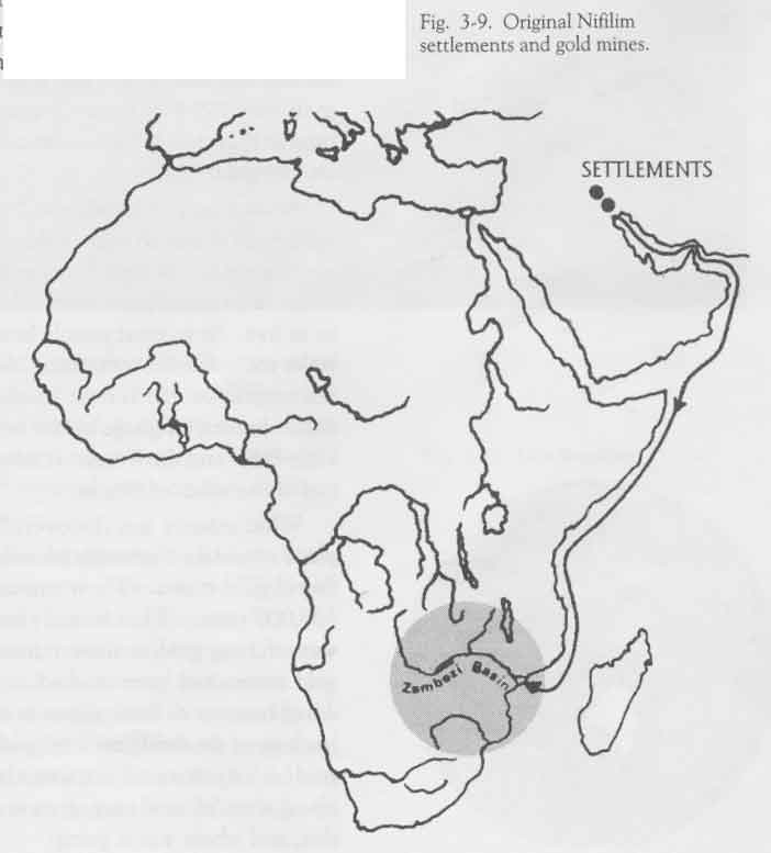 Нифилим могли совершать космические путешествия, но похоже, их возможности в то время не намного превосходили наши возможности сегодня. В записях Шумеров есть их изображения в космических кораблях, из задней части которых извергается пламя – это корабли-ракеты. Это начало космических путешествий, не очень развитое. В самом деле, они были настолько примитивны, что им нужно было ждать, когда Нибиру окажется достаточно близко к Земле, чтобы совершить даже это путешествие между двумя планетами. Они не могли просто взлететь в любое время, но должны были ждать до тех пор, пока расстояние окажется очень маленьким. Мне думается, что, поскольку Нефилим не могли покинуть солнечную систему, они обыскали все планеты, находящиеся здесь, и обнаружили, что на Земле есть большие количества золота. Итак, около 400 тысяч лет назад они послали сюда команду с единственной лишь целью – добывать золото. Прибывшие на Землю Нифилим были возглавляемы двенадцатью членами экипажа. Они были как бы начальниками над 600 рабочими, которые должны были вести добычу золота и ещё тремя сотнями людей, остававшихся на орбите в своём «материнском» корабле. Сначала они отправились в область нынешнего Ирака и начали там устраиваться и строить свои города, но золото они добывали не там (Рис.3-9). За золотом они отправлялись в одну долину на юго-востоке Африки.