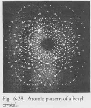 Прежде, чем начать рассматривать кристаллы, давайте исследуем это изображение, полученное с помощью рентгеновской дифракции (Рис.6-28). Если пропустить рентгеновские лучи вдоль оси С атомной матрицы кристалла или металла, то получится изображение этих маленьких точечек, точно показывающих, где расположены атомы. В данном случае, это кристалл берилла, который в самом деле проявляет изображение Цветка Жизни. Кристалл берилла располагает свои атомы в соответствии с этой схемой и так формируется именно этот кристалл. В самом деле удивительно, что эти маленькие атомы просто сами выстраиваются в пространстве, часто на огромных расстояниях друг от друга. Эти микроскопические пространства сравнительно обширны, примерно как между звёздами в ночном небе. Атомы замечательно выстраиваются сами в кубы и тетраэдры и какие угодно геометрические фигуры. Почему?