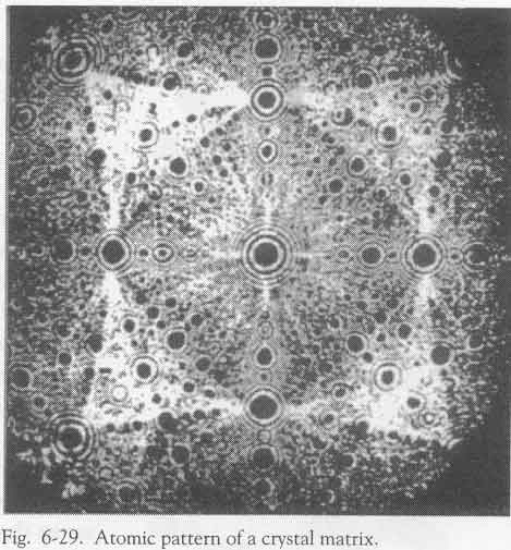 Вот модель рентгеновской дифракции кристалла (Рис.6-29). Тут видно, как атомы выстроились в кубический узор. Интересно то, что во всех различных формах, проявленных в Реальности, сами атомы – это сферы. Большинство исследователей упустили этот факт, но сфера является основной формой, из которой появилось всё в начале. Это важно при понимании творения.
