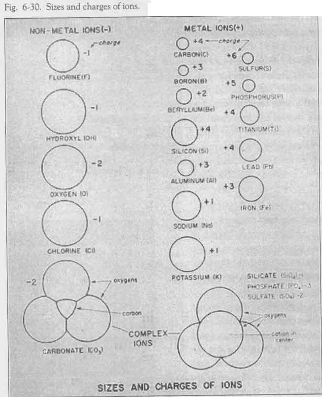Итак, сферы являются первичными составляющими воспринимаемой нами Реальности. Хотя электронная орбита описывает сферу, она может описывать и другие модели, как например, восьмёрку. Физики смогли расчитать это только для водорода, и до сих пор они только строят предположения относительно остальных. Если у атома слишком много или слишком мало электронов и он имеет либо положительный, либо отрицательный заряд, его называют ионом. Таким образом, первичными характеристиками атома являются его величина и заряд (Рис.6-30). Эти два главных фактора определяют, смогут ли различные атомы войти в состав одной молекулы. Есть ещё и другие тонкие факторы, но главными являются размер и заряд.
