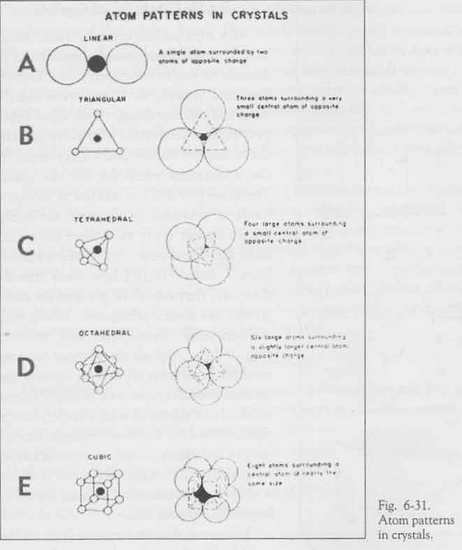 Рис.6-31 показывает, как атомы сочетаются. Это были главные модели, известные долгое время, до тех пор, пока не обнаружили существование квази-кристаллов. В этой таблице показаны различные разновидности атомов. Буква А показывает линейную модель с меньшим атомом в середине. Буква В показывает треугольную модель из трёх с меньшим атомом в середине. Маленький атом на самом деле может здесь быть или отсутствовать. Буква С показывает тетраэдральную модель, с одним атомом в середине или без него. Буква D показывает октаэдральную модель и буква Е показывает кубическую модель. Теперь, благодаря новой научной информации, мы можем добавить икосаэдральную и додекаэдральную модели.