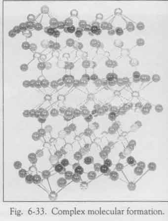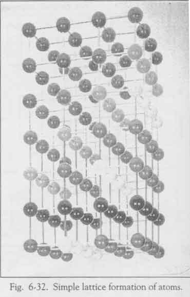 При процессе кристаллизации атомы всегда выстраиваются определённым образом (Рис.6-32). Они формируются, скажем, в куб и затем этот куб выстраивает рядом с собой другой куб и рядом с тем – ещё один куб и вскоре получается куб, связанный с другим кубом, который в свою очередь, связан со следующим кубом и так далее - формируя то, что именуется решёткой. Существуют всевозможные способы, какими атомы могут объединяться. Получающиеся в результате этого молекулы всегда связаны со священной геометрией и пятью Платоновыми телами. Удивительно то, как эти маленькие атомы знают, что следует отправляться именно в эти определённые места, особенно, если они составляют нечто очень, очень сложное!