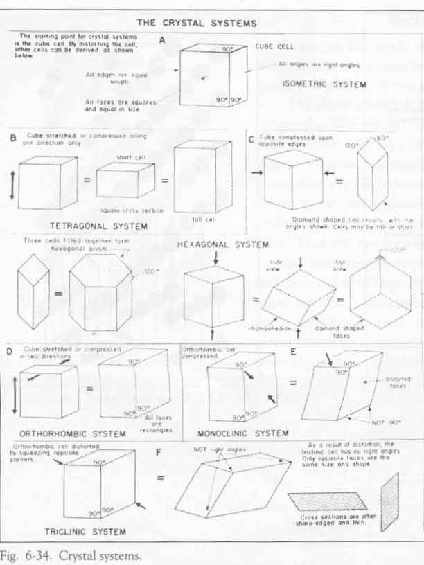 Теперь мы приступим к кристаллам. Существует по крайней мере сто тысяч кристаллов различного рода. Если вы когда-то бывали на Выставке Самоцветов и Минералов в Тусоне (Tucson Gem and Mineral Show), то вы точно знаете, о чём я говорю. Эта выставка занимает около восьми или десяти отелей, и каждое помещение этих многоэтажных отелей заполнено кристаллами. В зале вы увидите все самоцветы. Существует много-много различного рода кристаллов. И их находят ещё; почти ежегодно обнаруживается восемь, девять, десять совершенно новых кристаллов, доселе никому неизвестных. Но независимо от того, столько существует кристаллов, все они могут быть рассортированы по шести категориям: изометрические, тетрагональные, гексагональные, орторомбические, моноклинальные и триклинальные (Рис.6-34). И все эти шесть систем, используемых для классификации всех известных кристаллов, являются производными куба, одного из Платоновых тел. Важно, под каким углом вы рассматриваете куб – воспринимается ли он как квадрат, шестиугольник или прямоугольник, в противоположность нормальному углу куба в 90-градусов. Вот отсюда начинается самое интересное, по крайней мере, для меня – надеюсь, что и для вас.