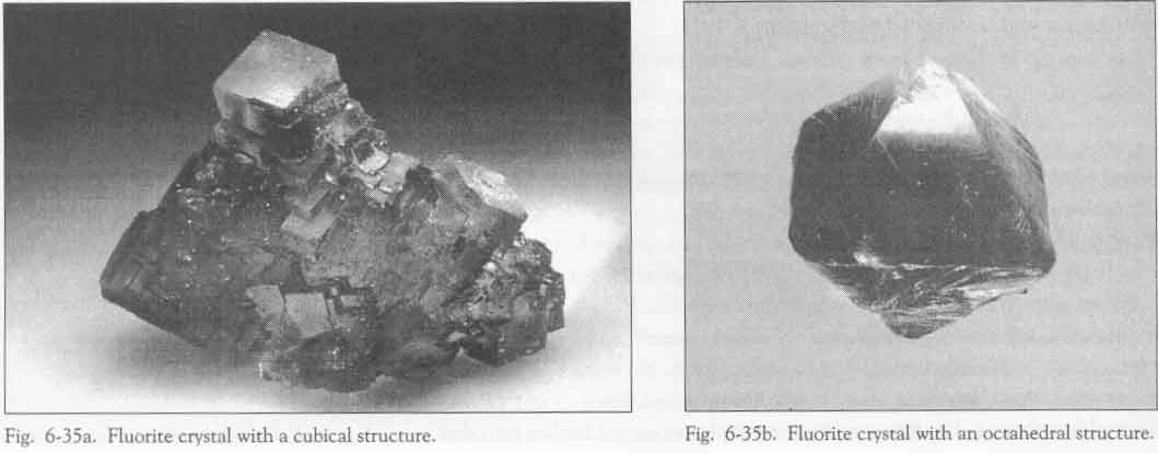 Вот кристаллы флюорита - плавикового шпата (Рис.6-35а и в). Плавиковый шпат находят почти любого мыслимого цвета, включая и прозрачный. В мире есть два крупнейших месторождения флюорита: одно в Соединённых Штатах и другое в Китае. Находят флюорит двух совершенно различных атомных структур: одна октаэдральная и другая кубическая. Этот фиолетовый флюорит составлен ил крошечных сжатых вместе кубов. Они совершенно необработаны, они такими выросли. Прозрачный кристалл флюорита представляет собой настоящий октаэдр. Он не был так вырезан, но в данном случае он таким и не вырос. Обычно он попадается пластами, и если вы его уроните или ударите, он разломится по самым слабым связям, которые оказываются октаэдральными, потому что атомы выстроены в октаэдральную сетку. Если бы я уронил это на твёрдую поверхность, то оно бы раскололось на целую кучу маленьких октаэдрончиков.