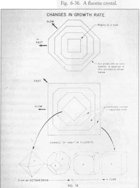 Но что особенно интересно, так это то, что флюорит будет вырастать из одной фигуры в другую – из кубической в октаэдральную и опять наоборот. В своём естественном состоянии, если дать ему достаточно времени, кубический кристалл когда-то превратится в октаэдральный. И при наличии достаточного времени октаэдральный кристалл флюорита станет кубическим. Они колеблются во времени, сначала становясь одним, затем другим, и опять туда и обратно через очень длинные периоды времени. Геологи обнаружили некоторые кристаллы флюорита в процессе изменения, но им было непонятно, как это они так колеблются.