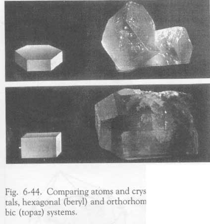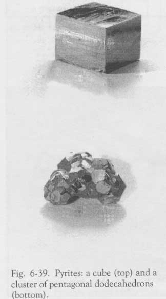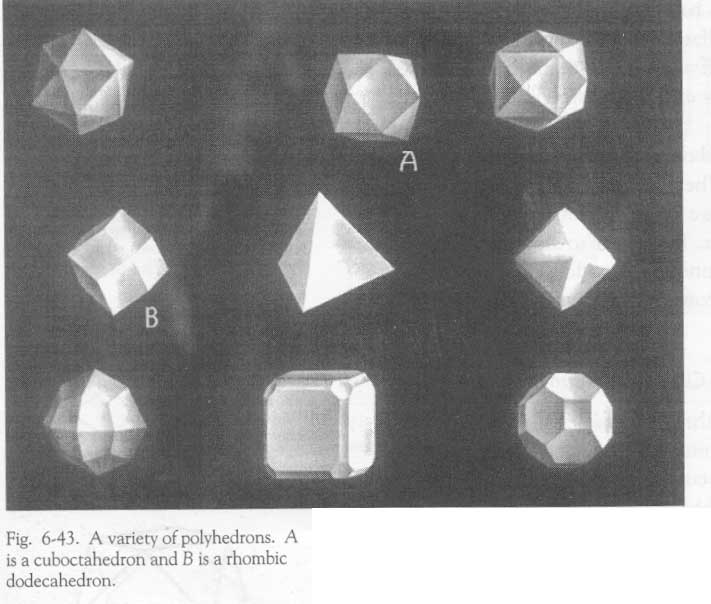 В верхнем правом углу Рис.6-38находится куб. Следующий слева от него куб огранён по своим рёбрам. Последующая двойная огранка превратила эту латку-перелатку в додекаэдр. Это пример куба/додекаэдра в кристаллах.