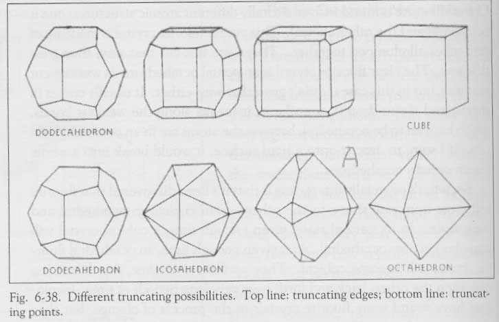 Одна книга по геологии пыталась объяснить такое изменение флюорита (Рис.6-36). Внизу справа вы видите куб. Если поровну срезать все его вершины, то это называется огранкой. Можно произвести огранку любого многогранника, то есть любую из этих многогранных форм. Проделывая это (в данном случае с кубом), можно срезать вершины, рёбра или грани, только срезать их надо так, чтобы все срезанные части были одинаковы.