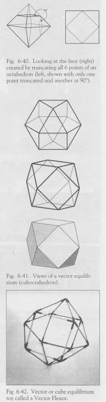 Вот трёхмерное изображение этой формы (Рис.6-41). Называют её кубоктаэдр или векторное равновесие. Можно увидеть, что первоначально это куб, но если угол в вершине А продолжить вверх, то получился бы октаэдр. Это – две формы единовременно, октаэдр и куб. Она и сама не знает, которой из них она является; она где-то посередине. Когда Бакминстер Фуллер обнаружил этот многогранник, то эта форма чуть не поглотила все его мысли. Он решил, что этот кубоктаэдр – первостепенная фигура, величайшая фигура из когда-либо вообще существовавших. Дело в том, что она способна на такое, на что ни одна другая форма не способна. Она была для него так важна, что он дал ей совершенно новое имя: векторное равновесие. Он обнаружил, что эта форма, через различные модели вращения, превращается во все пять Платоновых тел! Похоже, что эта единственная форма содержит в себе их все. (Рис.6-42).