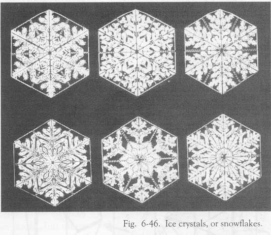 Кристаллизованная вода – кристалл льда – формирует эти гексагональные узоры, которые мы называем снежинками (Рис.6-46). Вы можете увидеть взаимосвязь с Цветком Жизни. Снова, снова и снова вы будете находить эту взаимосвязь трёхмерных моделей с геометрией, исходящей из этой одной центральной модели Цветка Жизни.