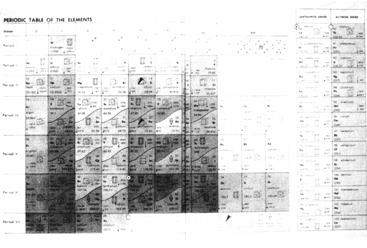 Вот эта версия Периодичесчкой таблицы элементов (Рис.6-47) интересна тем, что она показывает, как каждый элемент - за немногими исключениями, которые невозможно определить потому, что эти элементы не кристаллизуются - связан с кубом. Одним из этих немногих исключений оказывается фтор, потому что фтор не вступает в реакцию почти ни с чем. Это один из наиболее инертных газов. Но почти во всех остальных элементах мы находим эти кубические взаимосвязи, за исключением атомов четвёртого измерения, которые выпадают из естественной таблицы элементов и – синтетических, или созданных человеком атомов. Эти элементы естественно в природе не встречаются.