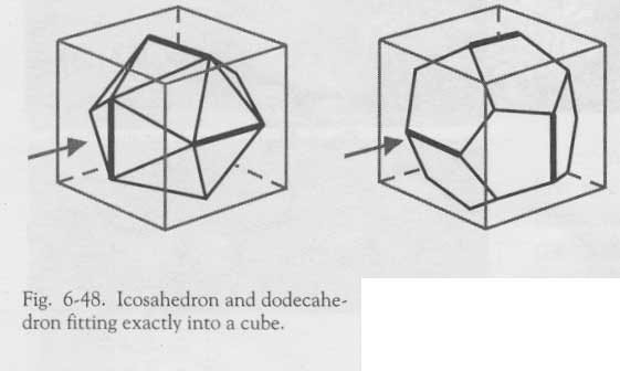 Дойдя до последних двух Платоновых тел, не возникает ощущения, что они могут симметрично поместиться в куб и сферу, но это так. Немного трудно показать это тут, но вы можете увидеть сами. Воспользовавшись подлинной моделью, просто найдите, где оба, икосаэдр и додекаэдр, имеют шесть рёбер на плоскостях куба, и у вас всё получится. Вы увидите, как они помещаются внутри граней куба (Рис.6-48 ).