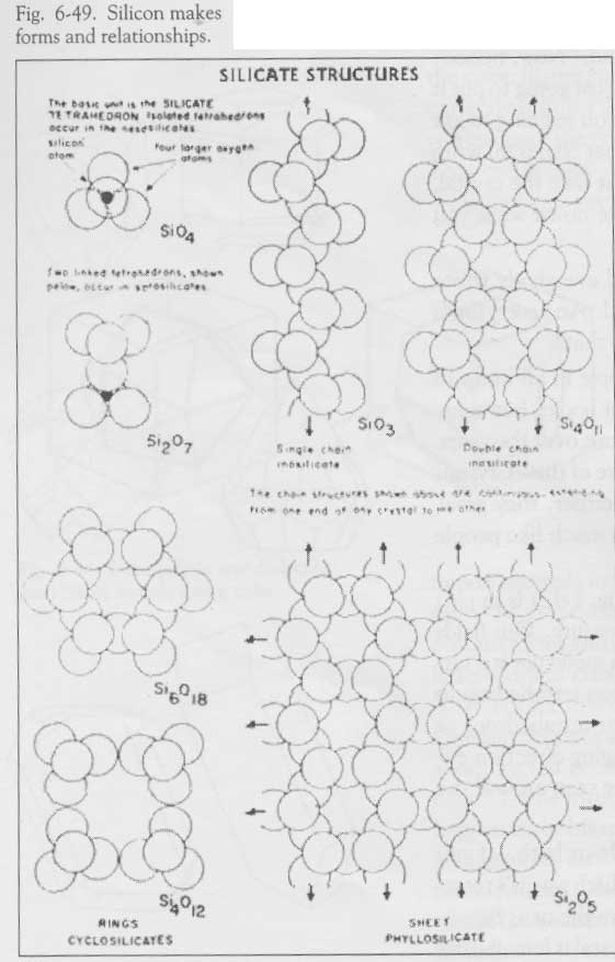 Вот изображение, о котором я говорю с большим удовольствием. Шестым элементом Периодической Таблицы является углерод. Поскольку дело касается нас, это самый важный элемент, потому что это – мы. Он составляет органическую химию; это элемент, делающий возможным существование наших тел. Нам говорили, что углерод является единственным живым атомом в Периодической Таблице, что порождает жизнь только органическая химия, и ничто больше. Но это определённо неверно. Учёные заподозрили это в 50-ых годах, когда начали эти явления исследовать. Они поняли, что кремний, который находится на карте прямо под углеродом (на одну октаву ниже), тоже проявляет признаки жизни. Похоже, тут нет разницы. Рис.6-49показывает, как кремний формирует некоторые цепи и модели. Это только некоторые. Кремний создаёт бесконечное число моделей, он химически реагирует почти со всем, что к нему приближается, и образует с ним какое-то соединение. Углерод обладает такими же возможностями, создавая бесконечное число форм, цепей и моделей и вступает в химическую реакцию почти со всем окружением. Это главнейшие характеристики, делающие углерод живым атомом.