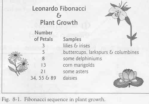 Схемы, по которыми сформированы лепестки, листья и семена цветов, соответствуют определённым числам, и в этом списке должны значиться цветы, которые, если я правильно уловил, я думаю, он видел на своих прогулках. Он заметил, что лилии и ирисы имеют по три лепестка, а лютики, живокость и водосбор (цветок в верхнем правом углу на Рис.8-1) - по пять. Некоторые шпорники имеют по 8 лепестков, ноготки имеют 13, некоторые астры же – 21 лепесток. Маргаритки почти всегда имеют 34, 55 либо 89 лепестков. Эти же самые числа начали встречаться ему всюду в природе, опять и опять.