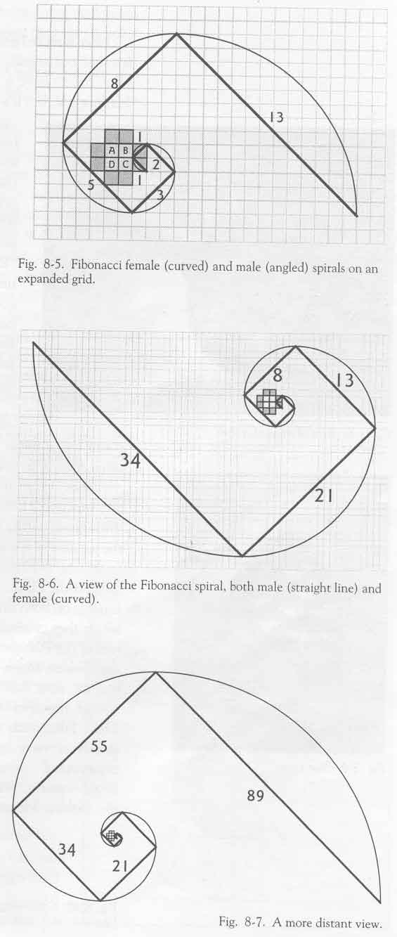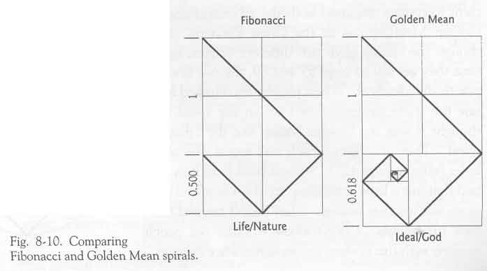 Рис. 8-10 показывает различие между двумя спиралями. Спираль Золотого Сечения идеальна. Она подобна Богу, Источнику. Как видите, верхние четыре квадрата на обоих рисунках – одинакового размера. Различие – в областях, где они получают начало (нижние отделы двух диаграмм). Область нижней части спирали Фибоначчи равна половине (0,5) области её верхней части; область нижней части спирали Золотого Сечения равна 0,618 области её верхней части. Спираль Фибоначчи, показанная на Рис.8-10 выстроена при помощи шести равных квадратов, в то время как спираль Золотого Сечения начинается глубже внутри (в действиетльности, она вообще никогда не начинается – она длится вечно, как Бог). Хотя исходные точки спиралей различны, их линии начинают очень быстро сближаться.