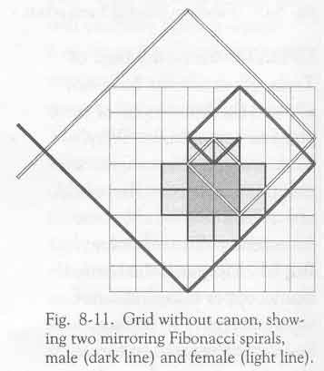 Начертив сетку в 64 клетки и объединив эту спиральную модель, мы получаем Рис.8-11. Наложив канон да Винчи на эту сетку восемь-на-восемь (Рис.8-12), мы обнаруживаем, что восемь заштрихованных клеток обладают уникальным свойством. Существует восемь возможных способов выведения спирали Фибоначчи из четырёх спаренных клеток. Давайте вернёмся к Рис.8-11 и воспользуемся верхними спаренными клетками как примером. Один способ начать, это – с верхнего правого угла, как показано чёрной линией. Она пересекает одну клеточку (1), поворачивает направо, чтобы пересечь ещё одну клетку (1), поворачивает направо ещё раз для пересечения двух клеток (2) – довольно интересно то, что в этой точке она достигает верхней линии данной сетки. Продолжая поворачивать направо, она пересекает 3 клетки (следующее число в этой последовательности) и – подумать только! - теперь она коснулась правой стороны сетки! Следующее число – 5 - приводит нашу линию к нижнему краю сетки. Потом будет число 8. И прежде, чем покинуть сетку, линия спирали пройдёт через три клетки. Число 8 проводит линию через три клетки перед тем, как покинуть сетку. По мере развертывания спирали из начальной клетки, прослеживается идеальное рефлективное качество зеркального отражения.