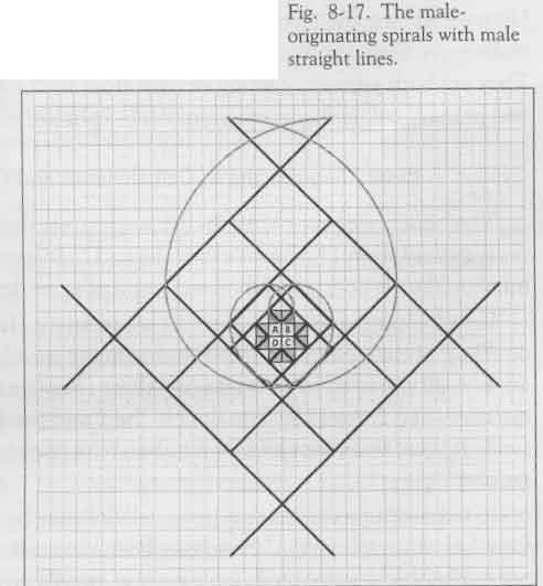 Для начала мы должны понимать, что существует два вида спиралей, в зависимости от того, составлены ли они из прямых линий (мужских) или изогнутых линий (женских). Об этом мы говорили раньше. Теперь же мы введём новое понятие. Точка возникновения спирали в этой геометрической модели в дальнейшем определяет, будет ли линия спирали мужской или женской. У спаренных квадратов есть четыре угла, где может возникнуть спираль: верхний левый, верхний правый, нижний левый и нижний правый (см. Рис.8-14). Два верхних положения производят мужские спирали, два нижних положения производят женские спирали. Линии мужской спирали никогда на пересекают четырёх центральных квадратов; женские линии делают это всегда.
