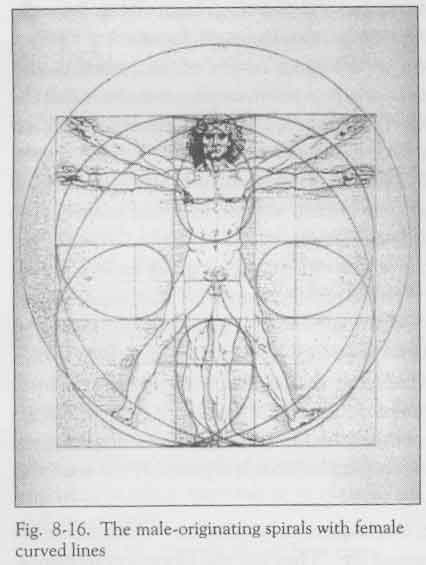 На Рис.8-17 мы видим вокруг тела человека спирали мужского происхождения. Здесь мы показываем мужской (прямолинейный) аспект, и только две спирали представлены женскими кривыми линиями.