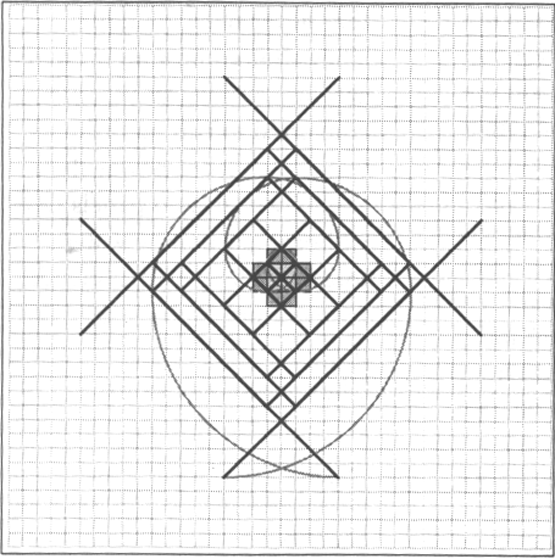 Воспльзовавшись диагональю, проведенной через всего лишь один крошечный квадрат фона, как меркой, назовём эту линию диагонали одной единицей. Затем будем двигаться в соответствии с числами Фибоначчи: 1, 1, 2, 3, 5, 8, 13, 21, 34, 89, совершая поворот откладываемой линии после каждого числа на 90º. Сначала мы откладываем одну длину, затем поворачиваемся на 90º и откладываем ещё одну длину. Потом делаем поворот на 90º и продвигаемся на две длины, следующий поворот на 90º и – продвижение по прямой на три длины. Перед каждым продвижением мы совершаем поворот на 90º. Следующий шаг имеет длину в 5 единиц, потом следует 8. Таким образом мы получаем отрезки длиной 1, 1, 2, 3, 5, 8, 13.