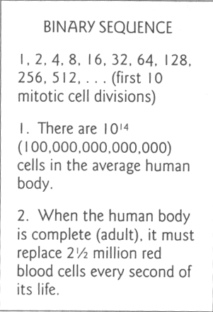 Согласно данным из книги Анны K.Пай и Элен Маркус Робертс «Генетика, её понятия и их содержание», (Anna C.Pai, Helen Marcus Roberts, «Genetics, Its Concepts and Implications») для того, чтобы дойти до количества 10 в четырнадцатой степени клеток тела человека, требуется в точности 46 митотических делений клеток. На это уходит только лишь 46 делений! Мне представляется магическим то обстоятельство, что это число, 46, как раз оказывается числом хромосом, которые имеются в нашей средней клетке. Случай или совпадение?