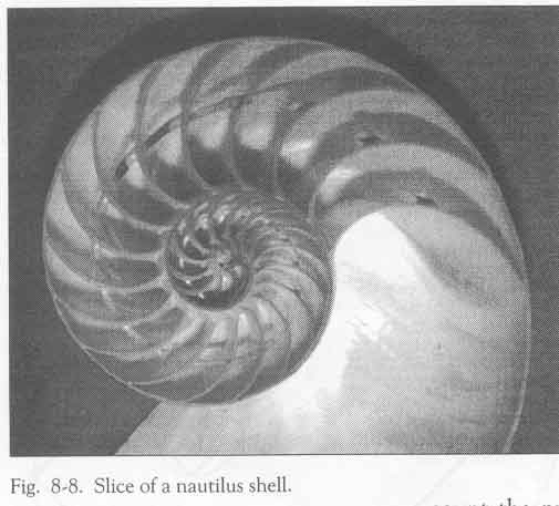 Вот священная геометрия в природе (Рис.8-8), подлинное явление. Это срез раковины моллюска наутилуса. Существует неписаное правило, что каждая хорошая книга по священной геометрии должна содержать в себе раковину наутилуса. Многие книги утверждают, что это спираль Золотого Сечения, но это не так – это спираль Фибоначчи.