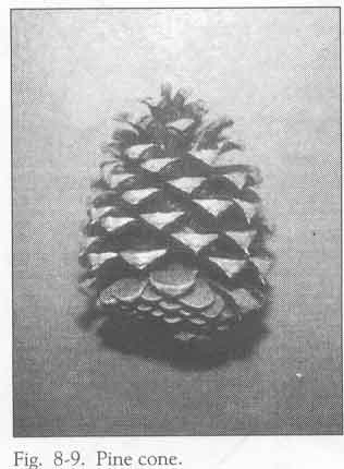 На этой сосновой шишке (Рис.8-9) вы видите двойную спираль, одна движется в одном, а другая в другом направлении. Если бы вы посчитали число витков спирали, вращающейся в одном направлении, а затем – в другом, то обнаружили бы, что это будут всегда два последовательных числа Фибоначчи. Возможно, это 8 оборотов в одном направлении и 13 в другом, или 13 в одном направлении, и 21 – в другом. Многие другие двуспиральные модели, находимые всюду в природе, соответствуют этому закону во всех известных мне случаях. Например, спирали подсолнуха всегда привязаны к последовательности Фибоначчи.
