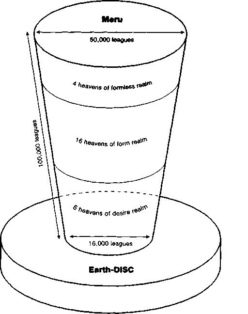 После формирования элементов, начинают образовываться семь континентов, горы, и океаны, как результат пяти элементов, вследствие соединения поддерживающего, взбалтывающего и формирующего ветров. Эти семь гор и семь континентов – результат элемента земли, который есть твердь. Семь океанов - результат элемента воды, который ни что иное как текучесть. Огонь солнца, молнии и внутренний огонь, происходит из элемента огня, который является жаром. Элемент ветра - подвижность, а элемент пространства - сфера, в которой происходит движение и рост.  Таким образом весь космос образуется из атомных частиц  пяти элементов для того, чтобы разумные существа смогли пережить результаты своих действий.